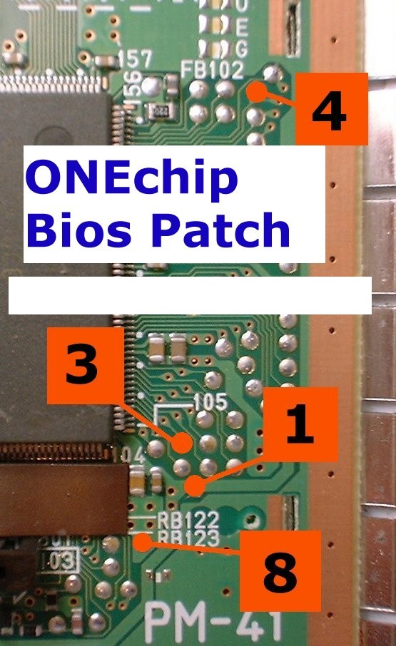 Диаграмма по установке модчипа на модель SCPH-102 ( PM-41) STEP 1. На чипе соединяем между собой с помощью перемычки 2 , 7 и 8 ножки чипа. STEP 2. Вынимаем материнскую плату из компьютера и затем сравнивая с нижней фотографией производим установку чипа в компьютер. Номера точек на плате соответствуют номерам ножек чипа. ( Верняя часть центральной платы. ) или можно использовать альтернативные точки указанные на другой фотографии : STEP 3. Далее нужно модернизировать систему цветности компьютера . "Х" помечена дорожка примерно в том месте , где ее нужно перерезать. А стрелкой помеченую точку замыкаем на минус компьютера . ( нижняя сторона платы ) WWW.CHIPI.RU