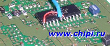 Диаграмма по установке модчипа на модель SCPH-5502 ( SCPH-5501) STEP 1. В комплекте с чипом входит кварц на 4.43Mhz и два конденсатора на 22pf. Все это нужно спаять по ниже указанной схеме. STEP 2. Вынимаем материнскую плату из компьютера , переворачиваем ее и затем сравниваем с ниже расположенной фотографией. Затем производим установку чипа в компьютер ориентируясь по той же фотографии. Номера точек на плате соответствуют номерам ножек чипа. STEP 3. Далее нужно модернизировать систему цветности компьютера . Ниже показана фотография формирователя сигнала цветности - СXA1645. Находим ее на плате и осторожно отпаиваем и отгибаем вверх 6 и 7 ножки микросхемы как показано на фото. 7 ножку м/c нужно через провод припаять к "-" ком-ра ( на фото красный провод ) , а на 6 ножку припаиваем провод от чипа " F out " ( на фото синий провод ). ( нижняя сторона платы ) WWW.CHIPI.RU