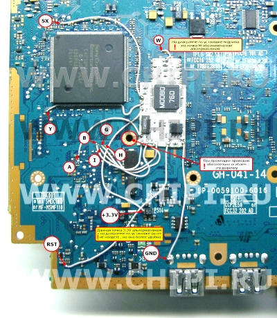 Иллюстрированный пример установки модчипа Модбо 760 |