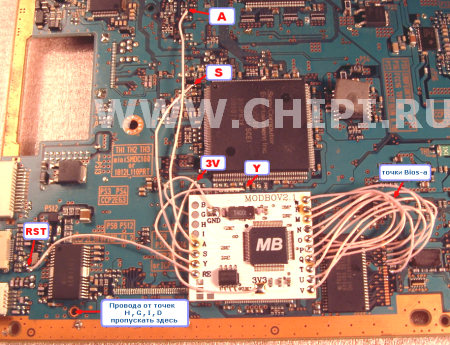 Теперь переходим к противоположной стороне платы . Там нужно подпаять ( ориентируясь по диаграмме ) всего 4 провода к точкам H,G,I,B  . Провода с нижней стороны платы  желательно разложить так , как указано на фото  ( аккуратно  и  без  перехлестывания  ) , потом пропустить сквозь дырочку , вывести на другую сторону платы к модчипу и подпаять к нужным точкам. Советуем насколько можно осторожней  залуживать точки  G,H,I,B и еще осторожней  припаивать к ним провода ( одного замыкания хватает , чтобы компьютер перестал запускаться).
