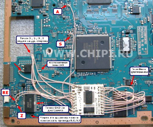, вывести на другую сторону платы к модчипу и подпаять к нужным точкам.