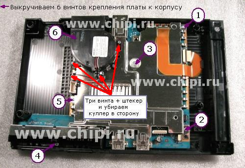 крепления матплаты к корпусу (помечены фиолетовыми стрелками и цифрами), снять
