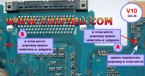 находим на фото точки А и B. Осторожно зачищаем эти точки от лака и залуживаем
