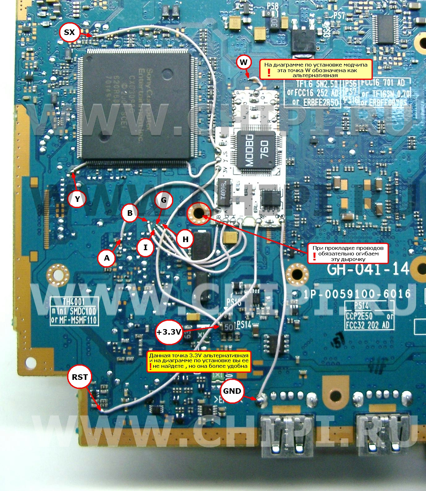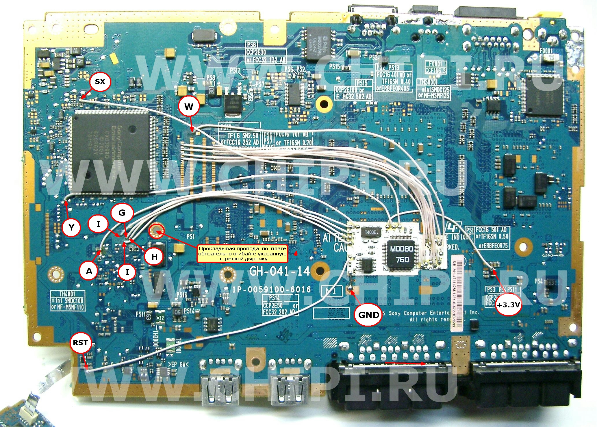 Иллюстрированный пример установки модчипа Модбо 760 |