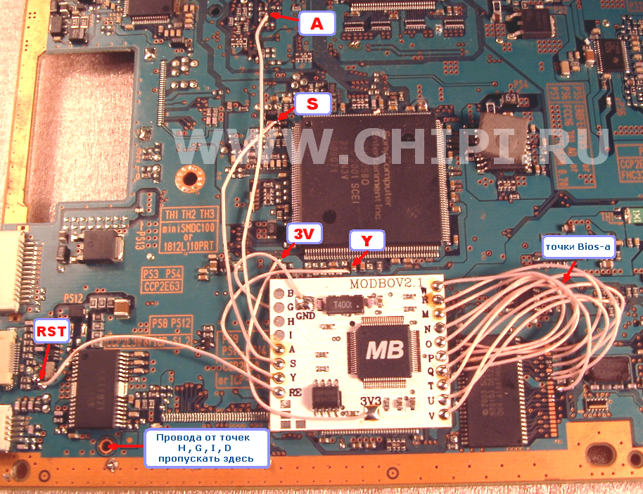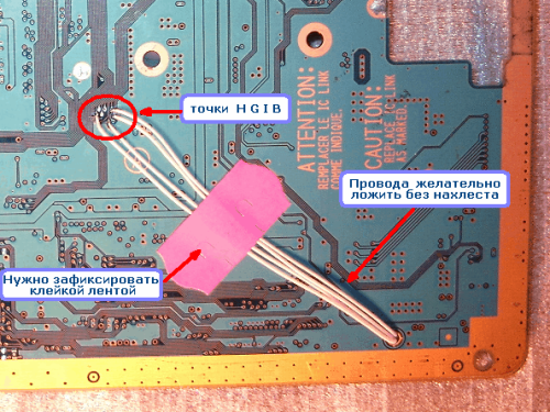 Теперь переходим к противоположной стороне платы . Там нужно подпаять ( ориентируясь по диаграмме ) всего 4 провода к точкам H,G,I,B  . Провода с нижней стороны платы  желательно разложить так , как указано на фото  ( аккуратно  и  без  перехлестывания  ) , потом пропустить сквозь дырочку , вывести на другую сторону платы к модчипу и подпаять к нужным точкам. Советуем насколько можно осторожней  залуживать точки  G,H,I,B и еще осторожней  припаивать к ним провода ( одного замыкания хватает , чтобы компьютер перестал запускаться).