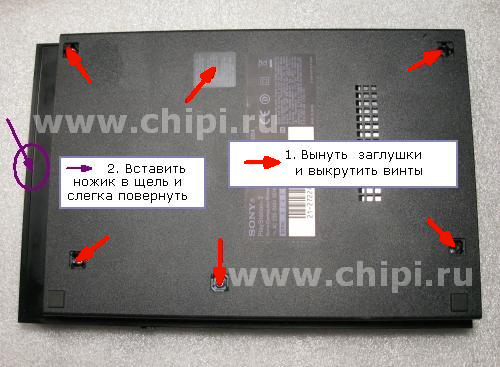 или скальпель ) и просовываем в щель корпуса ( место обозначено лиловым