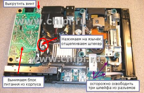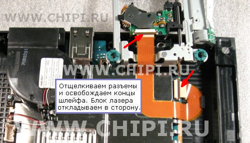 к освобождению дата-кабеля лазерного привода. Для этого нужно отщелкнуть защелки